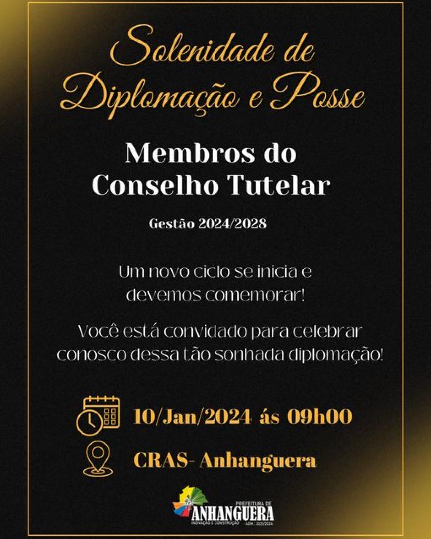 Publicado em: 08/01/2024 Solenidade se Diplomação e Posse, membros do Conselho Tutelar- Gestão 2024/2028 Você está convidado para celebrar conosco dessa tão sonhada diplomação!
