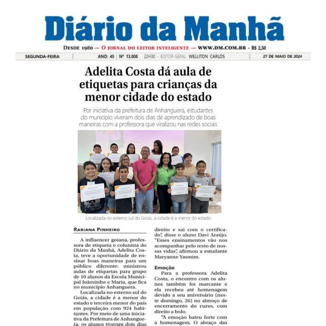 Publicado em: 27/05/2024 Olha só que legal! O curso de etiqueta promovido pela Prefeitura de Anhanguera para os alunos da rede municipal de ensino, com a influencer e professora de etiqueta Adelita Costa, saiu na imprensa goiana!
